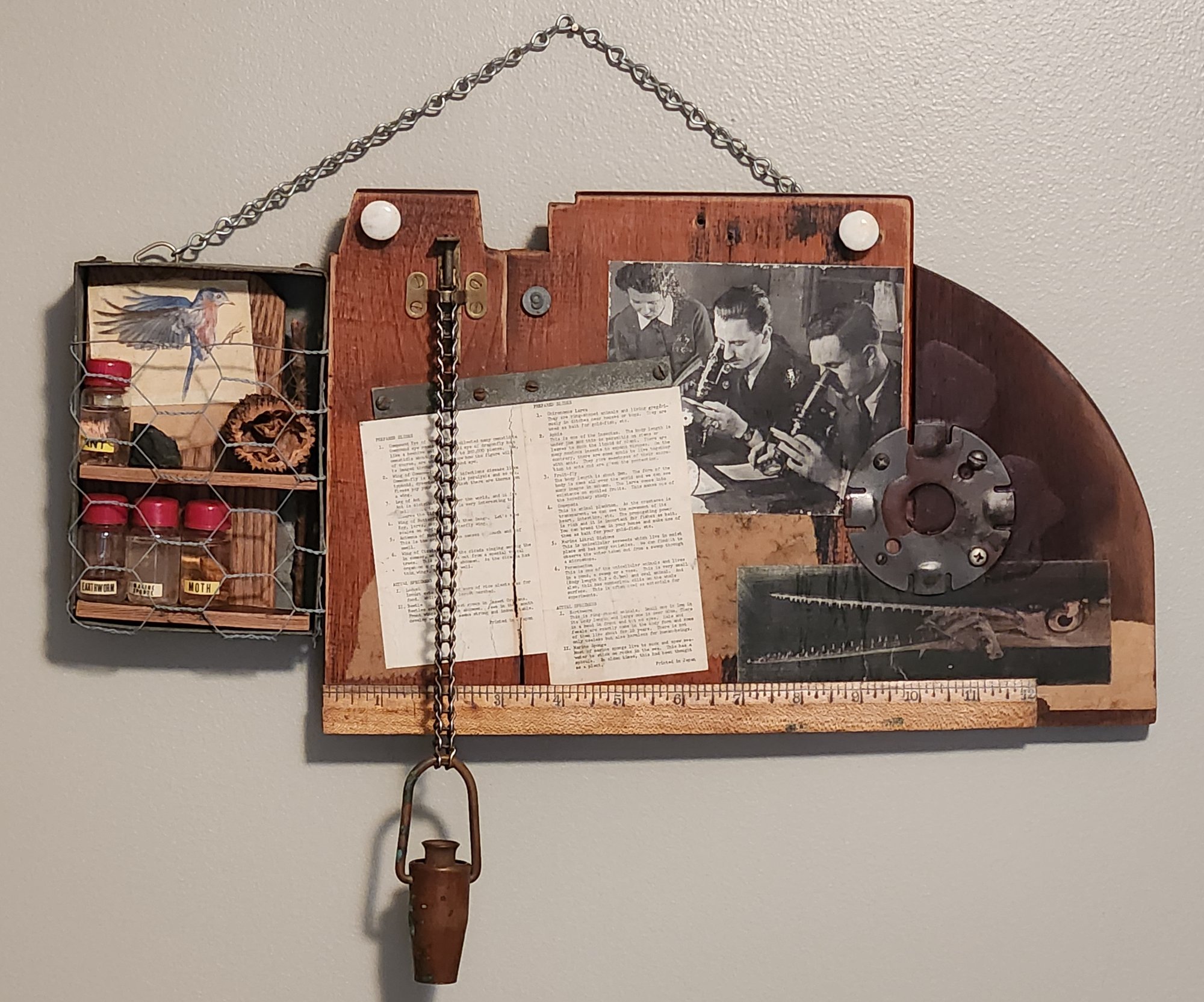 2019 Mixed media including wood, collage, found objects and paint. 18 in. w x 1 in. l x 9in. h